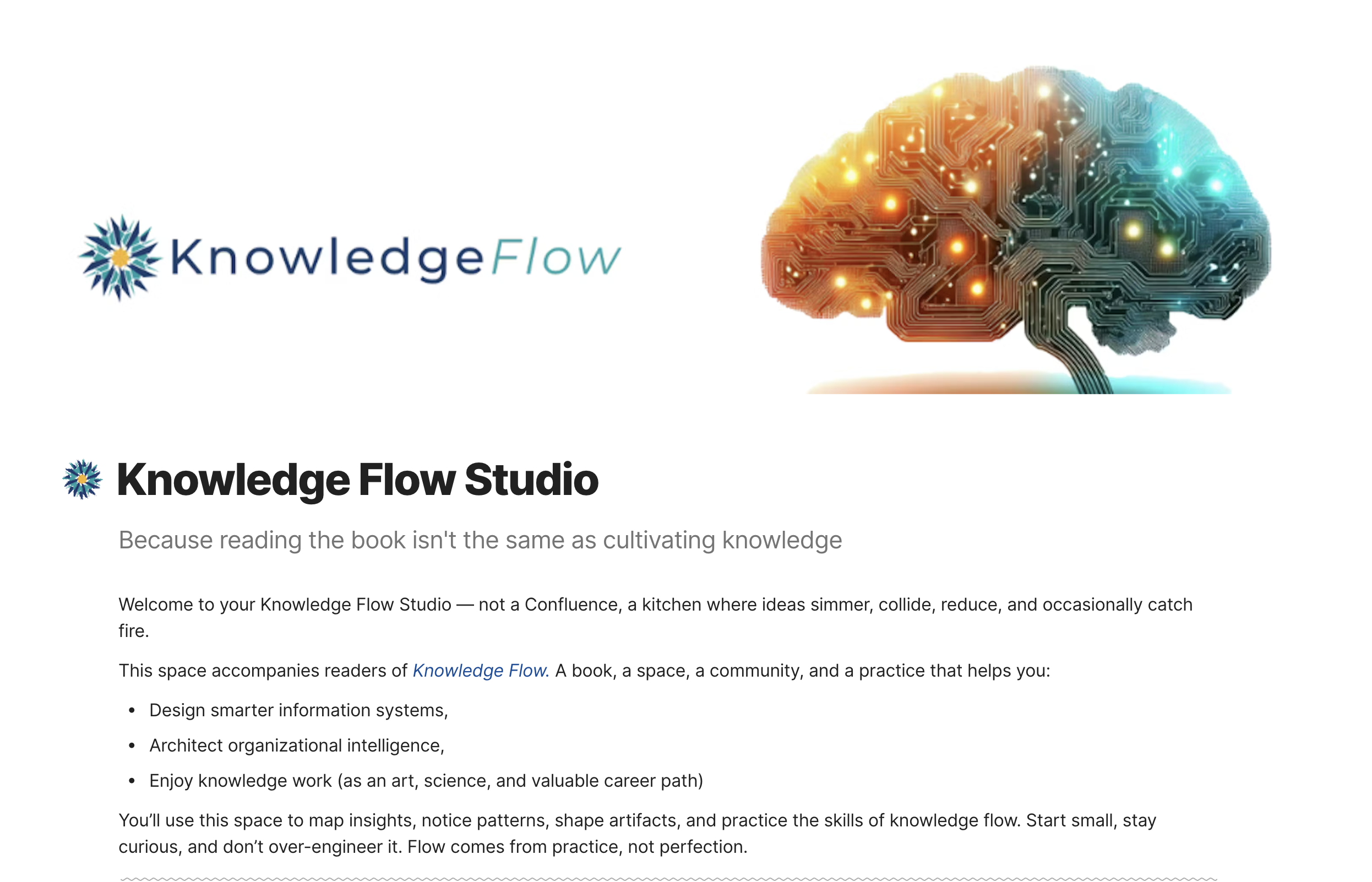 Welcome to your Knowledge Flow Studio — not a Confluence, but a kitchen where ideas simmer, collide, reduce, and occasionally catch fire. You’ll use this space to map insights, notice patterns, shape artifacts, and practice the skills of knowledge flow. Start small, stay curious, and don’t over-engineer it. Flow comes from practice, not perfection.